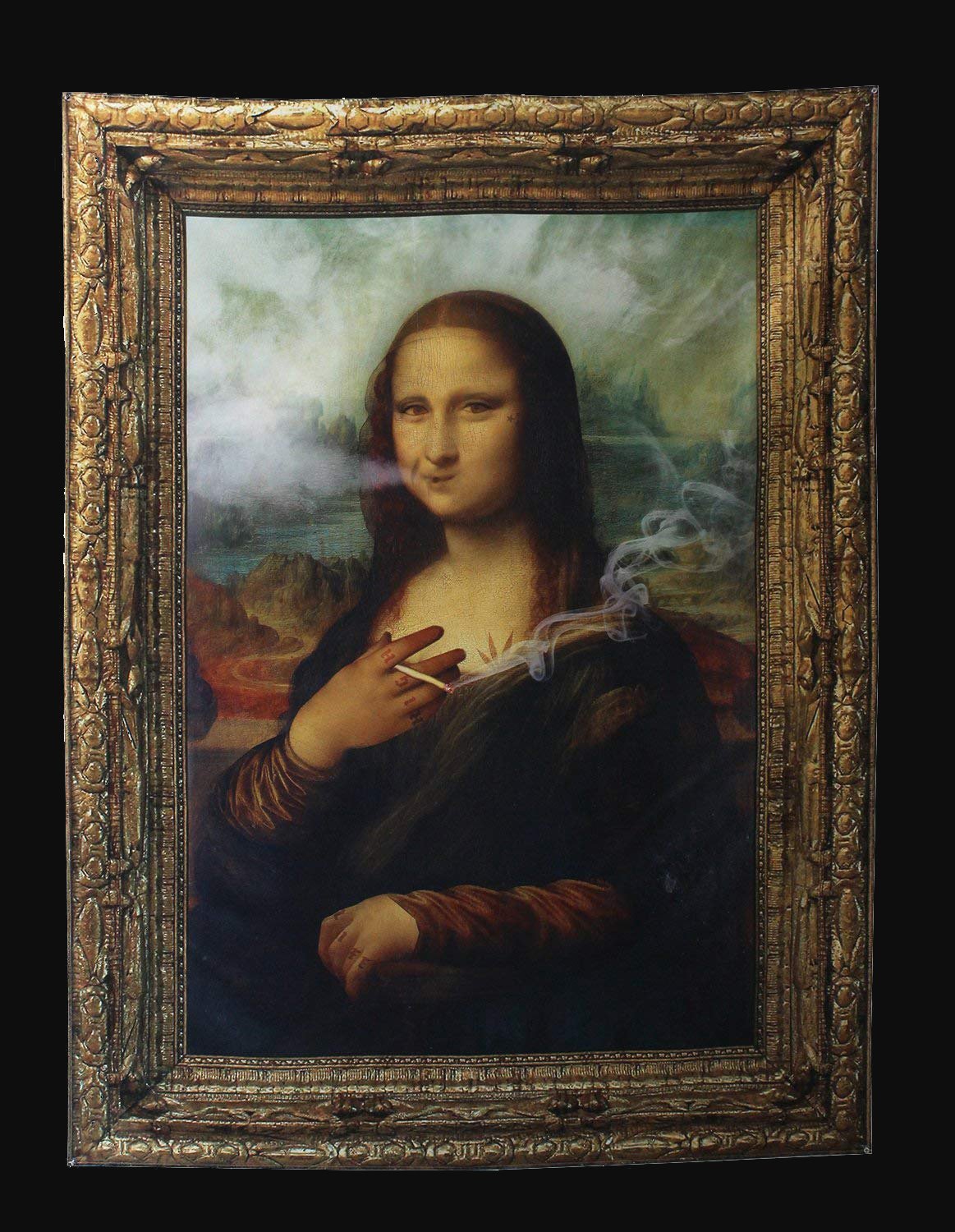 Huge 5ft (60 inches) tall, 46 inch wide Stona Lisa fabric print. Fabric poster is a Mona Lisa cannabis culture remix. High quality printed textile on nice polyester fabric. Machine washable, soak in water and put in dryer, or iron to remove wrinkles. Long lasting hard to damage artwork that packs up small.